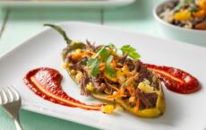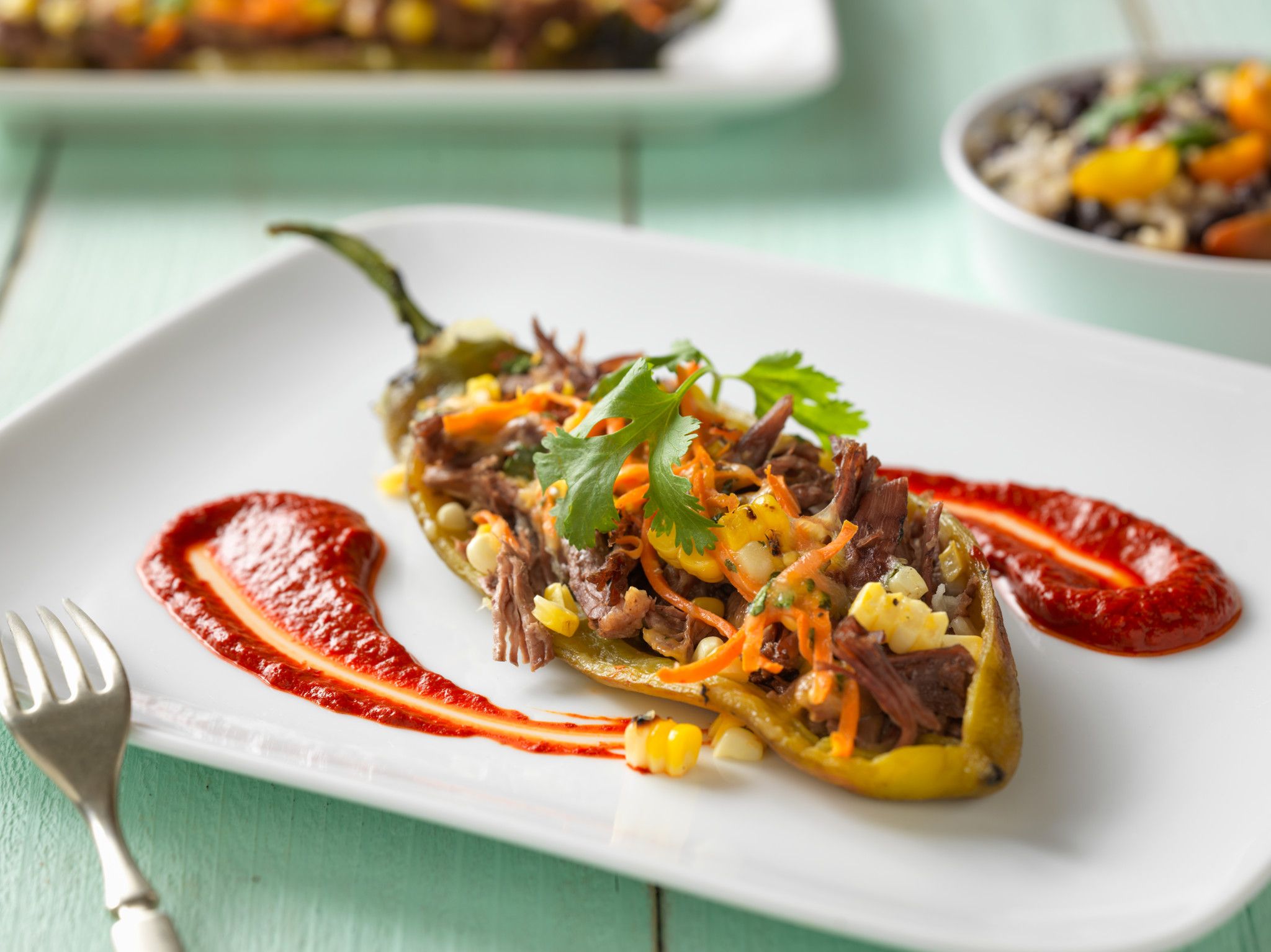 Shredded Beef-Stuffed Chile Relleno With Guajillo Chile Sauce